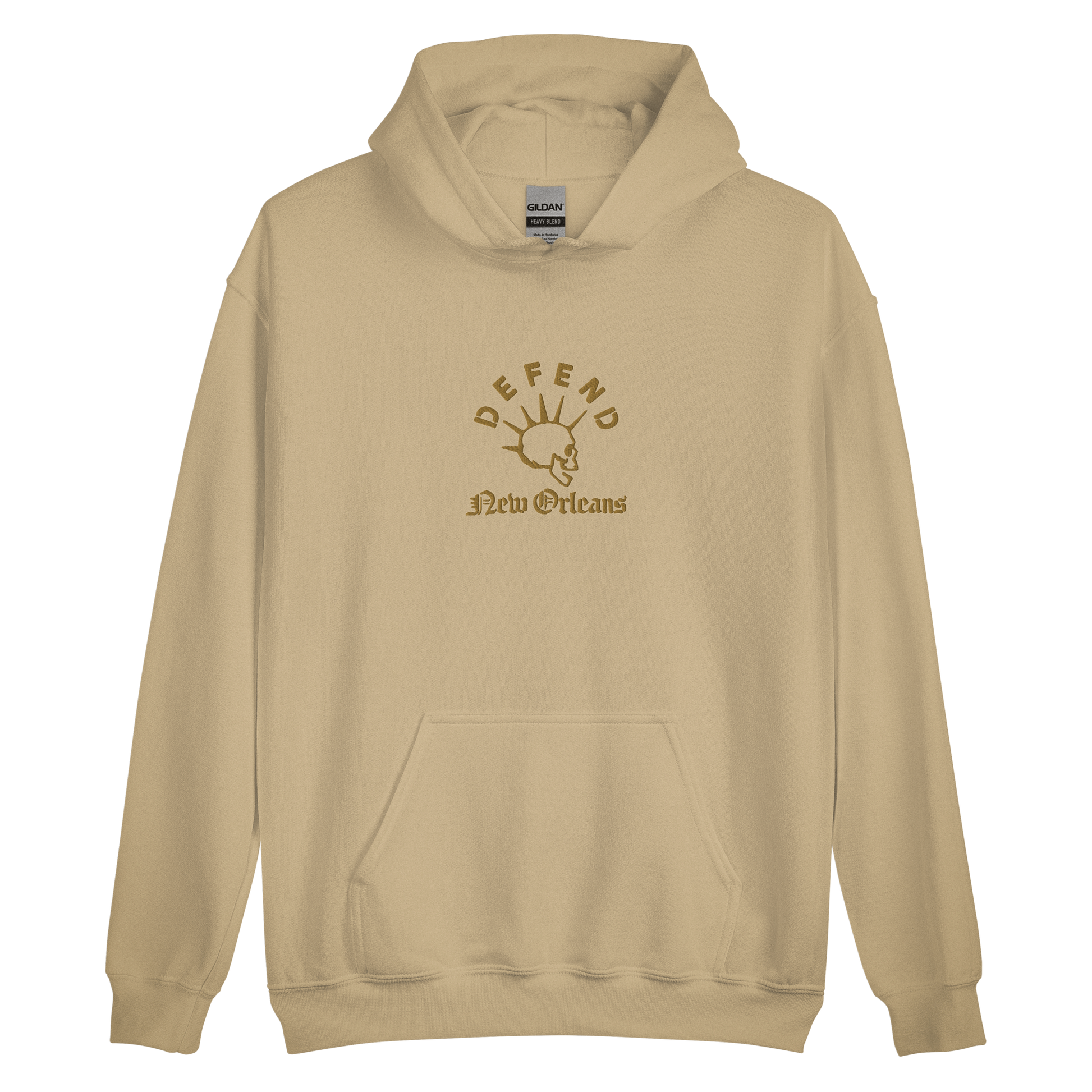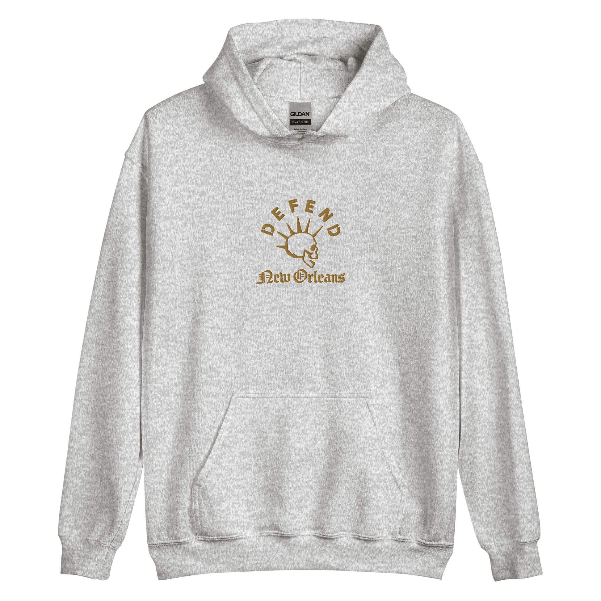 Sharp little version of the classic Defend New Orleans embroidered center front in old gold thread. Now available on classic quality Gildan hoodies in 3 colors.