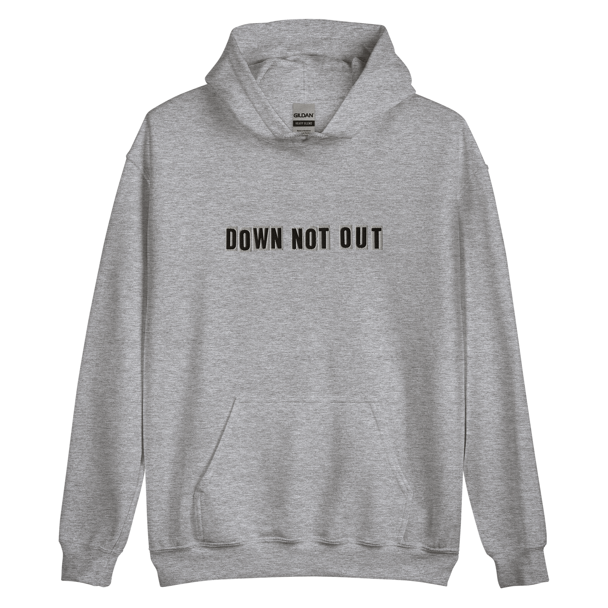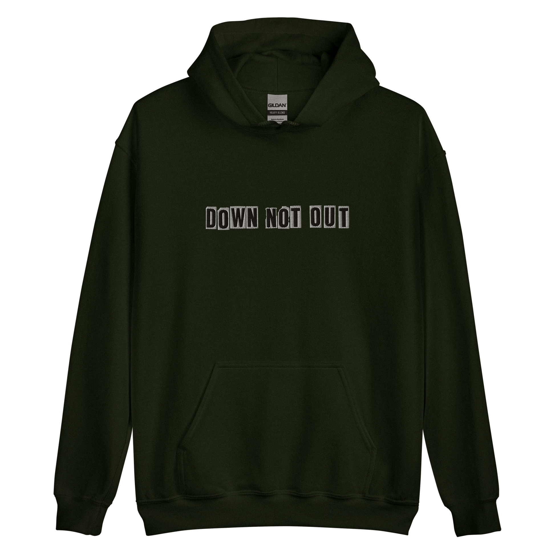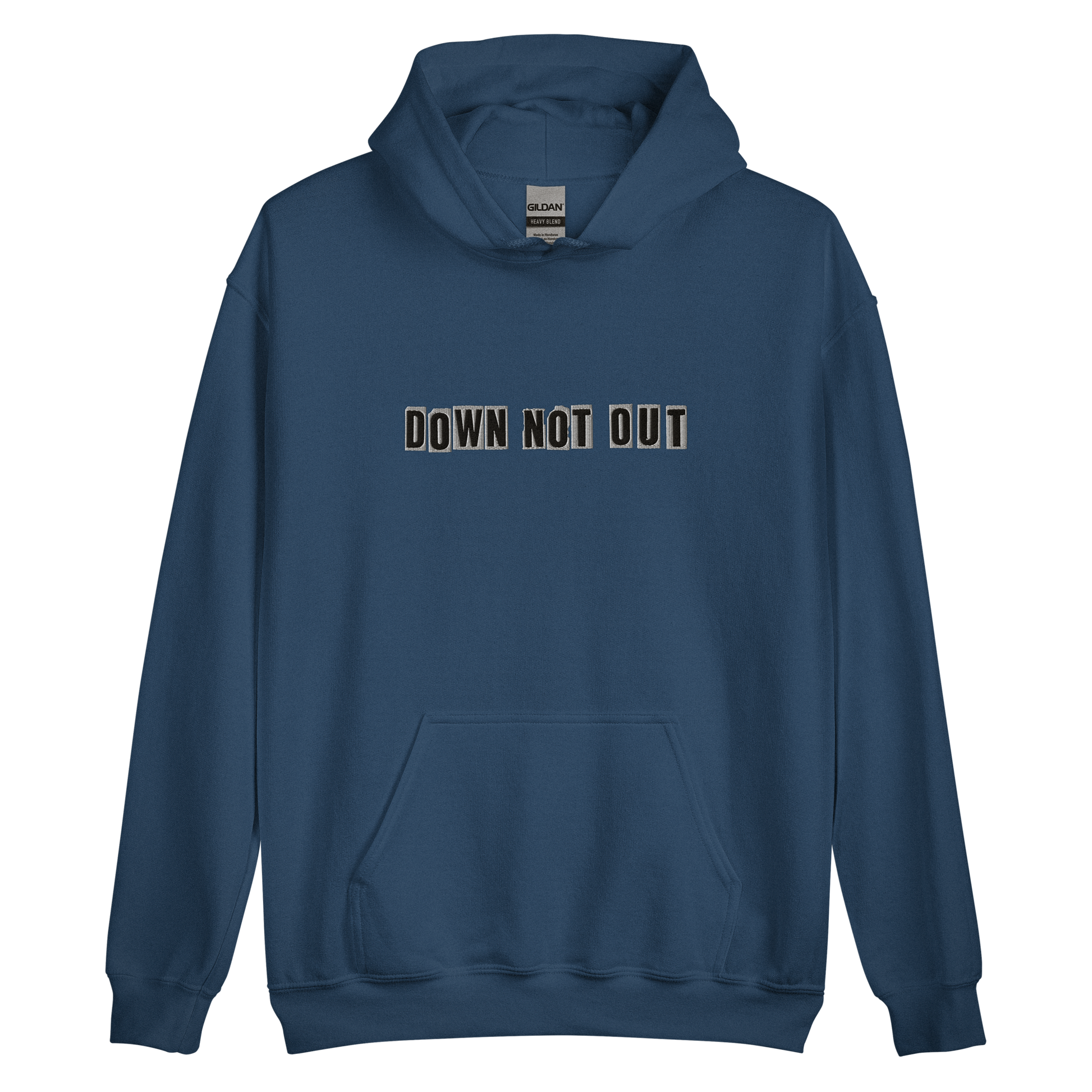 Down Not Out made from our old signboard letters and embroidered across the front of classic, heavy blend Gildan hoodies