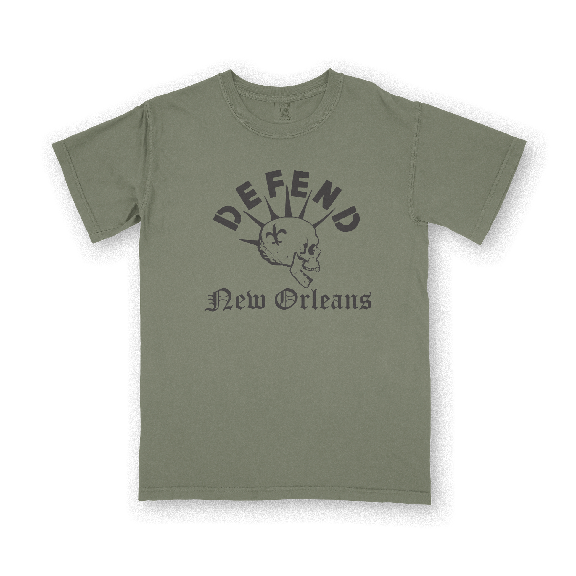 Classic Defend New Orleans printed on Comfort Colors t-shirts garment-dyed in your choice of Brick, Espresso, or Moss